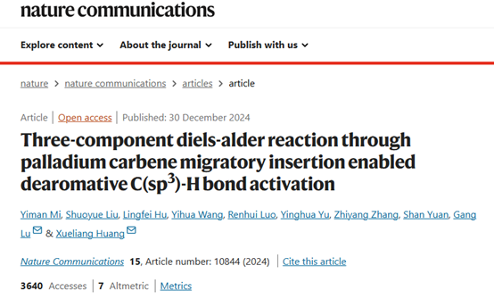 近日,我室黄学良教授课题组在桥联C-H键活化研究方面取得了新的进展,在《Nature Communications》发表了题为“Three-component diels-alder reaction through palladium carbene migratory insertion enabled dearomative C(sp3)-H bond activation”的学术论文。