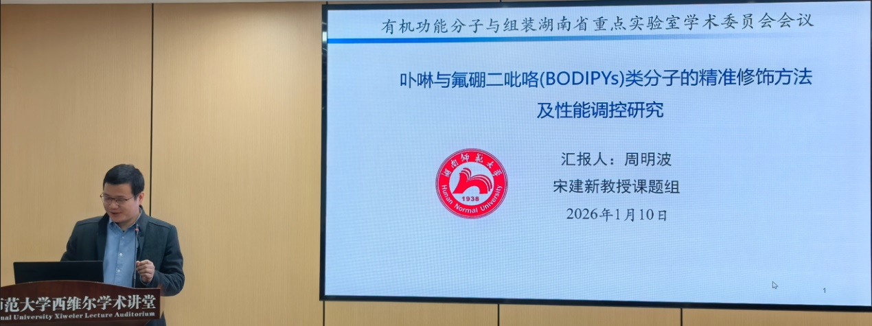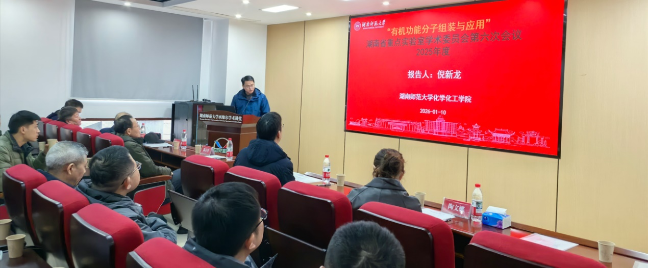 2026年1月10日,湖南师范大学“有机功能分子组装与应用湖南省重点实验室”在学院北栋222会议室举行学术委员会第一届第六次会议。出席本次会议的专家有南开大学刘育教授,北京科技大学姜建壮教授,中国科学院化学所陈传峰研究员,中国科学院上海有机化学研究所黎占亭研究员,湖南师范大学宋建新教授。湖南师范大学科技处陶文娜副处长代表学校参加会议并致辞。